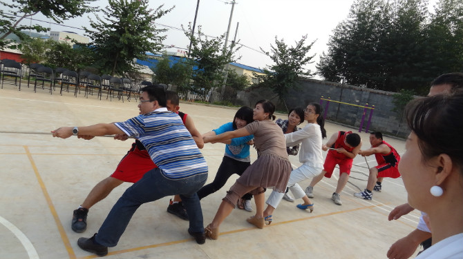 籃球賽后,雙方還進(jìn)行了激烈刺激的拔河比賽,雙方成員派出4男4女進(jìn)行拔河比賽,參賽隊(duì)員,啦啦隊(duì)、圍觀者人頭攢動(dòng),一派熱鬧的景象。隨著一聲哨響,兩邊隊(duì)員開(kāi)始奮力向各自的方向拉,場(chǎng)外的啦啦隊(duì)們扯著嗓子吶喊助威,中間的紅色繩子開(kāi)始搖擺,忽左忽右,僵持中,隊(duì)員臉上個(gè)個(gè)漲得通紅,經(jīng)過(guò)一番激烈的拉扯,紅繩之后到了金鷹隊(duì)這邊,勝利的喜悅彌漫了整個(gè)工廠的上空,不管是輸家還是贏家,大伙都玩得不亦樂(lè)乎。
