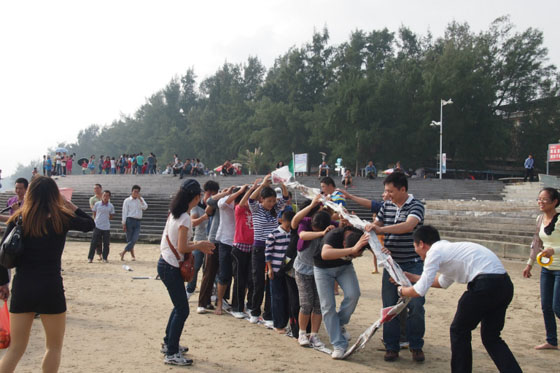 參觀完東興互市貿(mào)易區(qū)后職工們前往東興金灘,在沙灘上,公司還組織了一系列生動有趣的集體游戲,職工們分為三隊:青龍GRC部門組成的“青龍GRC,藝術(shù)家園隊”、青龍公司辦公室成員組成的“保溫防火,青龍在先隊”,以及青龍公司生產(chǎn)中心成員組成的“青龍防水,環(huán)保無濕隊”,三隊玩起了比賽,游戲項目豐富多彩,如撈橘子、無敵風(fēng)火輪等,大家都玩得不亦樂乎。