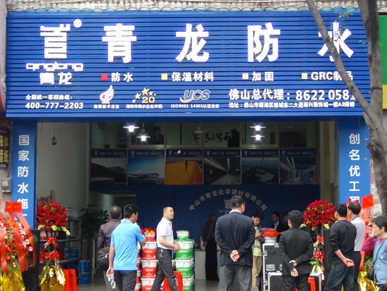 ?。翟拢慈?,伴隨著喜慶的民樂,熱鬧的鑼鼓,位于佛山市南海區(qū)桂城東二大道南興裝飾城一樓A8商鋪的青龍防水佛山總代理專賣店隆重開業(yè)。經(jīng)過精心的裝修,藍底白字的“青龍防水”門牌顯得格外顯眼,而店前的花籃也為開業(yè)慶典增添了節(jié)日的氣氛。青龍建材集團董事長宋敦清、廣東省區(qū)域服務(wù)人員,以及一百多位防水業(yè)界嘉賓到場祝賀。
