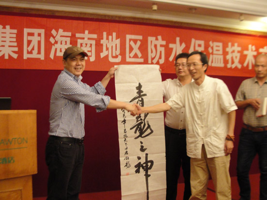 北京聯(lián)合大學(xué)易學(xué)與經(jīng)濟(jì)發(fā)展研究中心副主任、北師大易學(xué)文化講師游三林教授做“建筑學(xué)、居家與風(fēng)水”主題的演講,為現(xiàn)場的參會者解答疑惑。演講完畢后,游教授現(xiàn)場將一副名為“青龍之神”的毛筆字贈(zèng)與青龍集團(tuán)董事長宋敦清。
