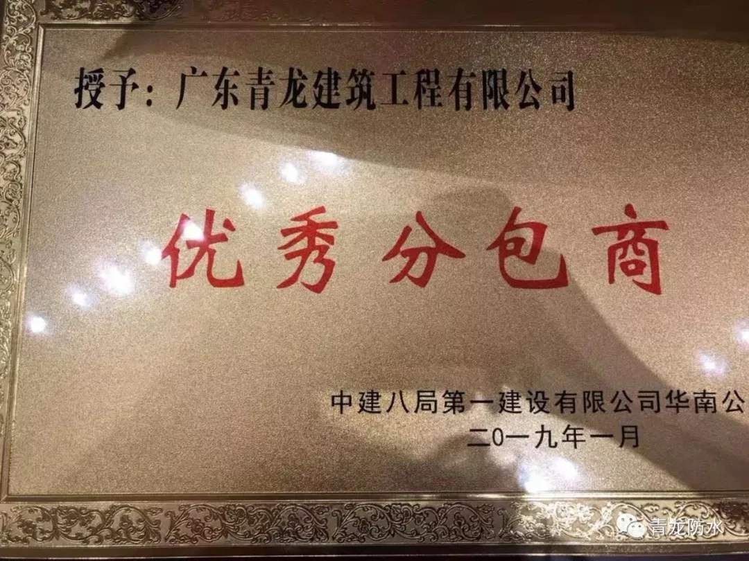 2019年1月,在中建八局第一建設有限公司華南公司2018年度優(yōu)秀分包商座談會上,我司喜獲"優(yōu)秀分包商"獎項,高度彰顯了青龍公司卓越的技術(shù)實力以及優(yōu)質(zhì)的服務能力。