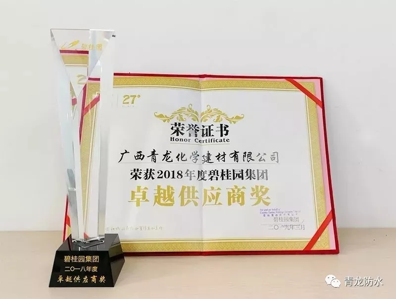2019年3月7日下午,正值首屆"建筑防水工技能實操大賽"鏖戰(zhàn)正酣,在碧桂園集團2018年度供應商大會上,青龍公司憑借過硬的產(chǎn)品質(zhì)量和良好的企業(yè)服務體系,喜獲2018年度"卓越供應商獎"稱號。