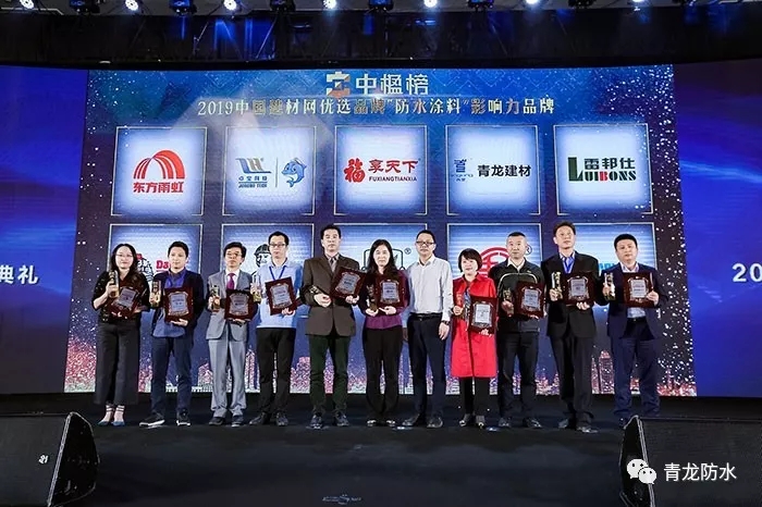 2019年5月9日,以"聚焦精裝,共筑未來"為主題的2019房地產(chǎn)供應鏈發(fā)展峰會暨"中楹磅"中國建材網(wǎng)優(yōu)選品牌頒獎典禮在廣州香格里拉酒店隆重舉行,青龍建材應邀出席,同時憑借品牌實力和市場影響力成功榮獲防水材料影響力品牌獎,這是對青龍公司長期以來的品牌經(jīng)營和市場拓展的肯定與褒獎。