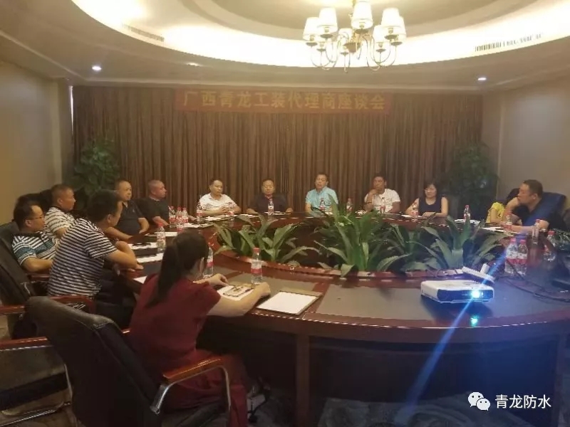 為共謀發(fā)展,攜手共贏,2019年6月22日至23日,青龍防水廣西代理商座談會在廣西北海曼哈頓酒店順利召開。青龍公司董事長宋敦清等青龍高層,以及南寧、北海、柳州、梧州、玉林、桂林、河池等市的青龍防水代理商,大家聚集一堂,通過分析總結(jié)、深入探討,對工程防水市場目前暴露出的問題、潛在的困難和發(fā)展瓶頸等課題進行深入淺出的分析和研討。