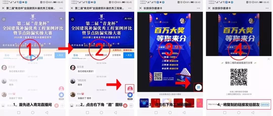2、邀約朋友進直播間觀看有獎:凡邀約朋友進入青龍直播間觀看,直播榜單上的邀約人數,即成為你的邀約榜單人數,每邀約1人即可獲得1元獎勵。最終獎勵僅限前10名。同時為保證活動的公正性,凡后臺發(fā)現數據增加異常,系統(tǒng)將自動判定為惡意作弊,將取消其參加活動資格。(邀約方法:青龍直播間→右下角"邀"圖標→右下角二維碼圖標→將復制的鏈接發(fā)給微信朋友。朋友點擊后,即成為你的邀約下線。)