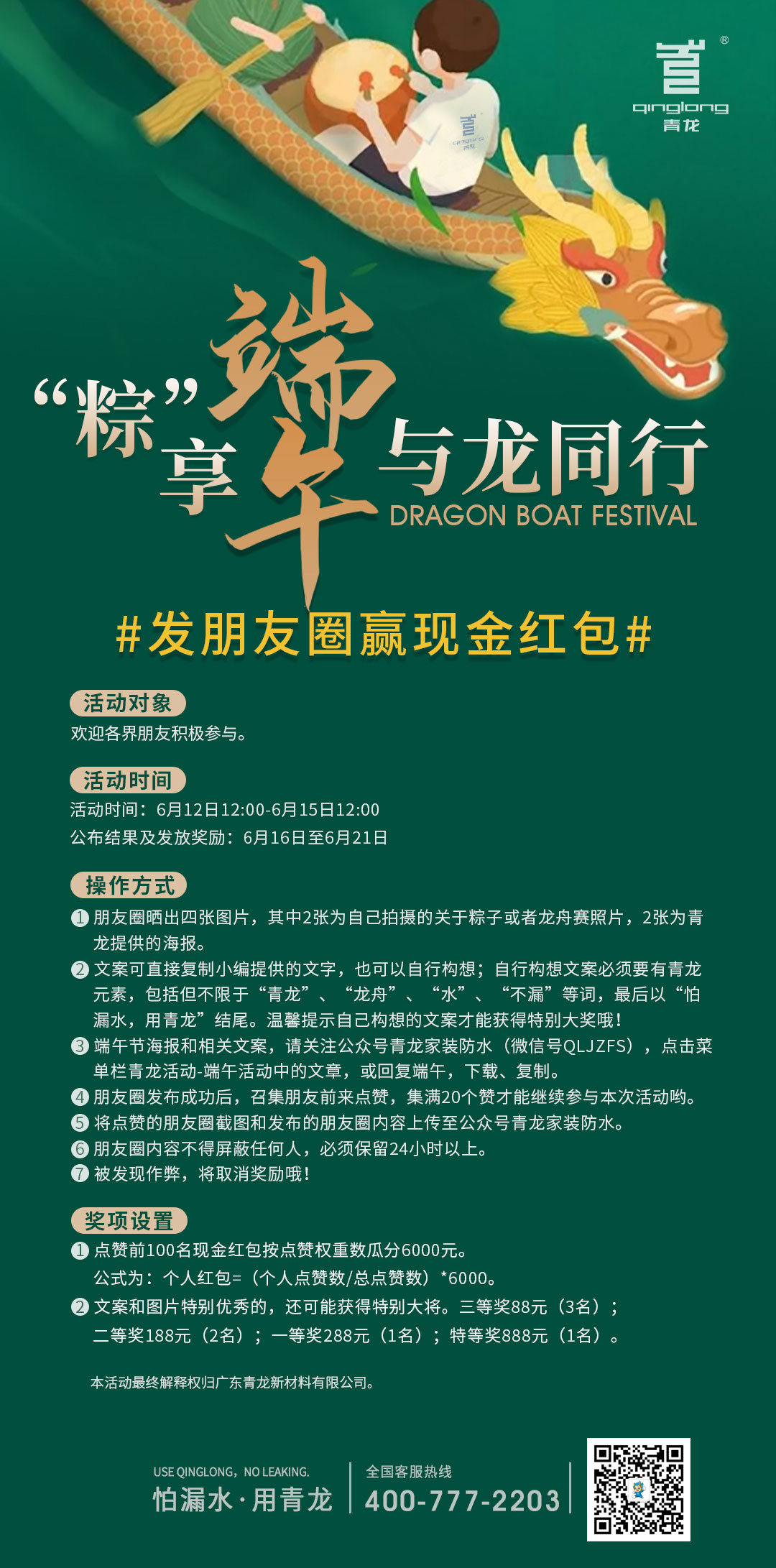 在端午節(jié)這個(gè)特殊的節(jié)日,青龍向一直關(guān)心和支持青龍事業(yè)的朋友,表示誠摯的感謝!為了增加大家快樂指數(shù),讓今年的端午節(jié)留下一份美好回記,青龍準(zhǔn)備了7800多元現(xiàn)金紅包給大家!我們誠摯邀請您參加我們的發(fā)朋友圈獲現(xiàn)金紅包的活動。
