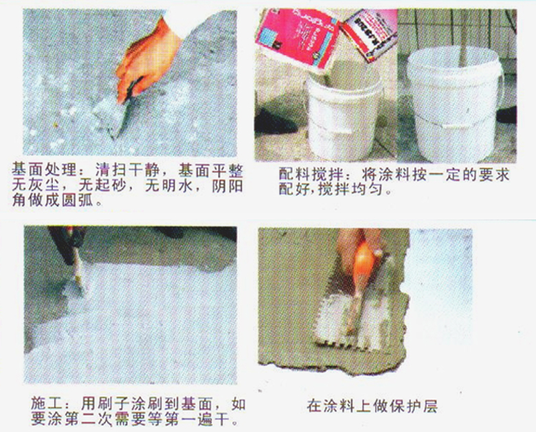 1.適用于屋面、地下工程隧道、泳池、食用水池及室內工程基面,如:剛凝固的水泥砂漿找平層上,地下室剛拆模的基面上,或基面淋雨潮濕(無明水)均可直接施工。