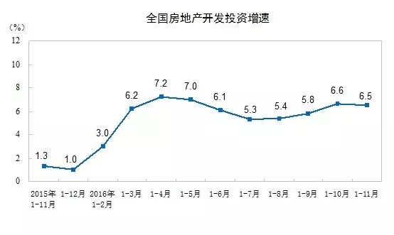 (1)2016年1-11月份,全國房地產(chǎn)開發(fā)投資93387億元,同比名義增長6.5%,住宅投資62588億元,增長6.0%,住宅投資占房地產(chǎn)開發(fā)投資的比重為67.0%。