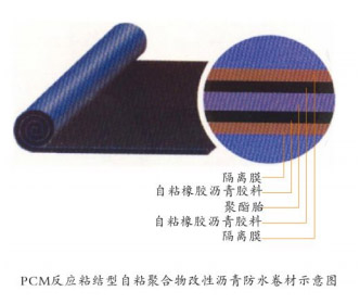 PCM反粘結(jié)型自粘聚合物改性瀝青防水卷材有兩種類(lèi)型,一種是由合成橡膠和樹(shù)脂改性瀝青中加入特殊改性劑,聚酯胎為胎體,聚乙烯膜為表面材料或無(wú)膜(雙面自粘),采用硅油防粘隔離膜制成的;另一種是由PET聚酯膜(鍍鋁、鋁塑復(fù)合)、自粘橡膠瀝青料、硅油防粘隔離膜組成。