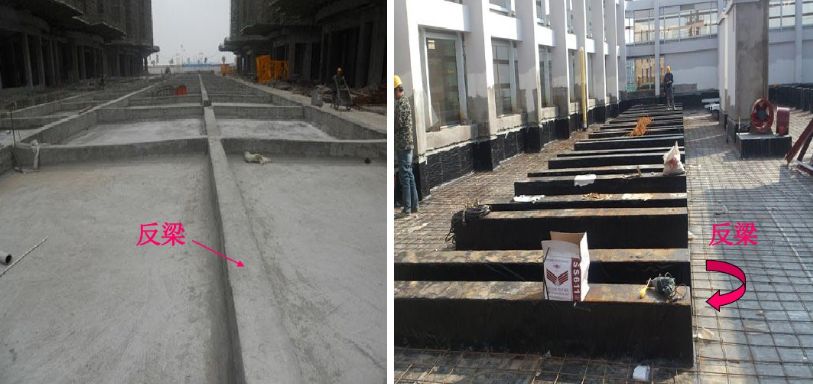 10、反梁:反梁只是一種需要,是因?yàn)槟承┰颍ㄈ鐚痈卟粔?、梁底面需要平整,而梁上部又可上翻等),而把梁高的一部分作到樓板的上方(一般的梁都是與樓板平的)或者是筏板基礎(chǔ)上表面需要平整而把梁做到板的下面。