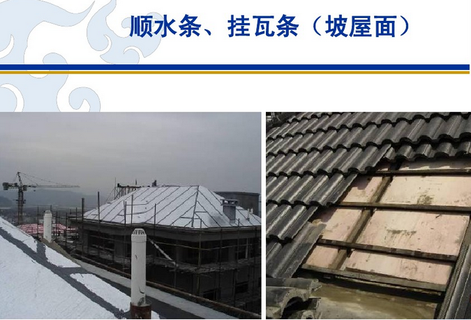 16、順?biāo)畻l:瓦下沿豎直方向設(shè)置的屋面構(gòu)件。處于掛瓦條下,防水層上。主要作用是架空掛瓦條。掛瓦條作用是將屋頂表面的瓦片固定在相應(yīng)位置。搭配使用合適的順?biāo)畻l可以使得屋頂?shù)呐潘Ч屯L(fēng)效果顯著增強(qiáng),有利于保持夏季的涼爽和冬季的溫暖。