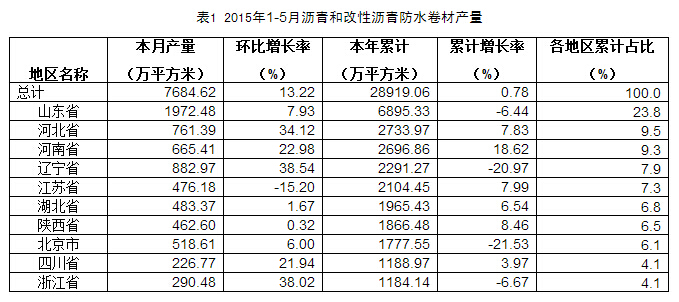 為進(jìn)一步了解我國(guó)瀝青和改性瀝青防水卷材產(chǎn)量,國(guó)家統(tǒng)計(jì)局對(duì)產(chǎn)量較大的176家防水企業(yè)進(jìn)行統(tǒng)計(jì),1-5月,瀝青和改性瀝青防水卷材產(chǎn)量為28919.06萬(wàn)平方米,同比增長(zhǎng)0.78%;其中山東地區(qū)產(chǎn)量較大,為6895.33萬(wàn)平方米,同比下降6.44%,占全國(guó)累計(jì)產(chǎn)量的23.8%。
