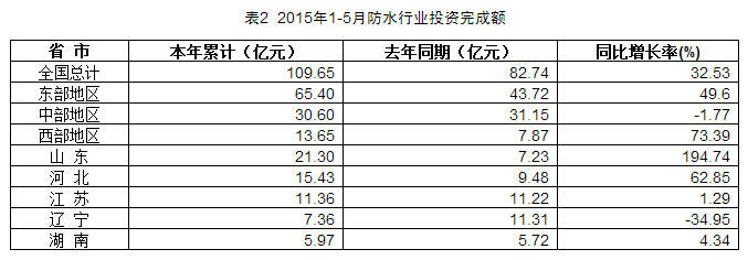 國(guó)家統(tǒng)計(jì)局對(duì)主營(yíng)業(yè)務(wù)收入高于2000萬(wàn)元企業(yè)進(jìn)行統(tǒng)計(jì),1-5月,防水行業(yè)投資完成額109.65億元,同比增長(zhǎng)32.53%。其中,山東地區(qū)的投資完成額為21.30億元,同比增長(zhǎng)194.74%。