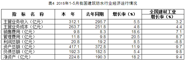 對(duì)全國(guó)491家主營(yíng)業(yè)務(wù)收入在2000萬(wàn)元以上的企業(yè)進(jìn)行統(tǒng)計(jì),資料顯示,1-5月,防水行業(yè)企業(yè)累計(jì)主營(yíng)業(yè)務(wù)收入312.1億元,同比增長(zhǎng)5.5%,增幅高于全國(guó)建材工業(yè)2.3個(gè)百分點(diǎn)。主營(yíng)業(yè)務(wù)成本增幅略高于全國(guó)建材工業(yè)。利潤(rùn)總額為20.8億元,同比增長(zhǎng)8.5%,全國(guó)建材工業(yè)利潤(rùn)總額負(fù)增長(zhǎng),同比下降8.8%。