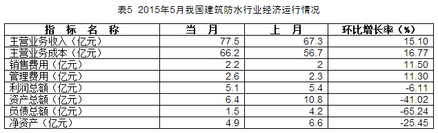 5月,防水企業(yè)主營(yíng)業(yè)務(wù)收入為77.5億元,環(huán)比增長(zhǎng)15.10%。利潤(rùn)總額為5.1億元,環(huán)比下降6.11%。