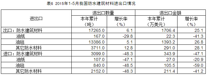 1-5月,建筑防水材料出口17265.0噸,同比上升6.1%;出口金額為1706.4萬(wàn)美元,同比上升25.1%。
