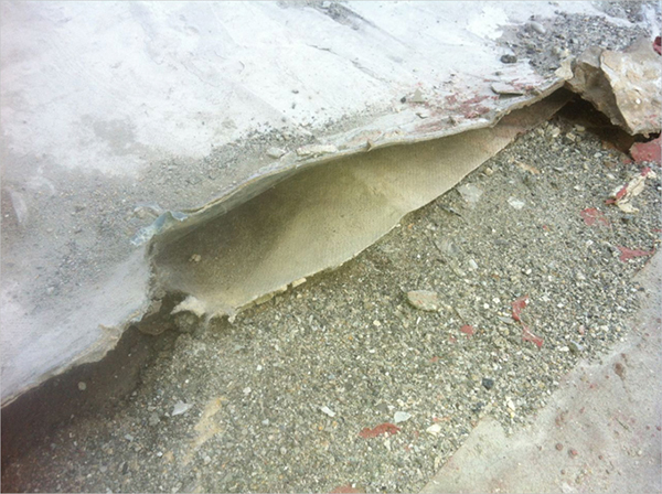 (三)在結(jié)構(gòu)沉降、溫差、震動、氣壓差、荷載變化等各種復(fù)雜的運行條件下,鋪裝完畢的剛性水泥涂層與聚乙丙綸卷材、混凝土基層三者之間的形變不一致,導(dǎo)致防水層開裂、分層和脫落而失效。